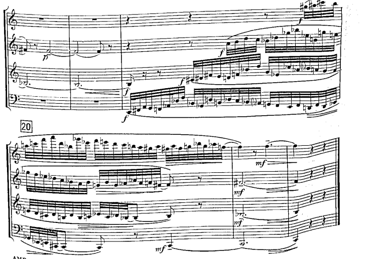 Etude #2) A 32nd note run consisting of 28 notes is passed around the quartet. Carter distorts the pulse of the movement by starting the run on different subdivisions of the beat. The run is passed off one instrument at a time but then is quickly placed closer and closer until it is played by all four instruments almost on top of each other. An intense feeling of pulse and technical precision is required for this movement.